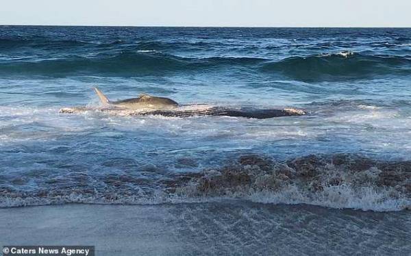 Ngoài thu hút một đám đông những người đi bãi biển, xác con cá voi khổng lồ còn thu hút ước chừng 30 con cá mập hổ, 20 con cá mập bò và tới 10 con cá mập sẫm tới ăn.