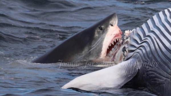 Joanne Jarzobski cho biết hiện chưa rõ nguyên nhân vì sao con cá voi chết. Con cá mập kích thước lớn nhưng con cá voi to hơn gấp nhiều lần.