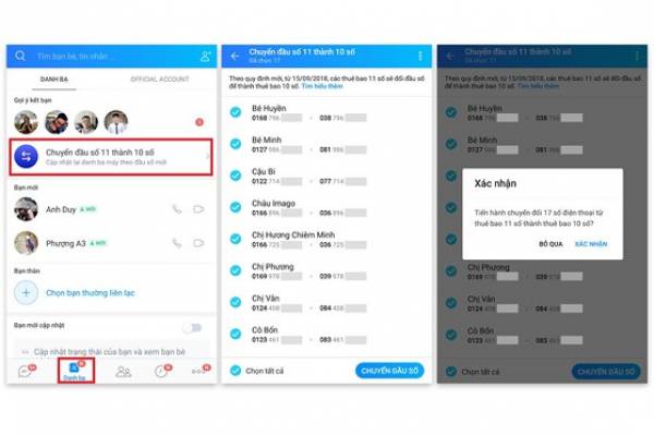 Đầu tiên, bạn hãy mở ứng dụng Zalo trên điện thoại, chuyển sang mục danh bạ và bấm vào tùy chọn Chuyển đầu số 11 số thành 10 số. Lúc này, danh sách các số điện thoại cần chuyển sẽ hiển thị, người dùng chỉ cần nhấn Chọn tất cả và tiến hành Chuyển đầu số, nhấn Xác nhận để bắt đầu.