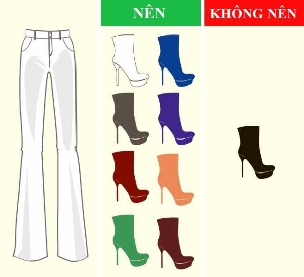 Quần màu trắng: Trắng là gam màu cơ bản có thể kết hợp với hầu hết màu sắc. Tuy nhiên, theo các chuyên gia thời trang, sẽ là không phù hợp nếu như bạn kết hợp quần trắng với giày màu đen trong trang phục thường ngày hoặc khi làm việc văn phòng. Nó khiến bạn trông lòe loẹt và kém sang.