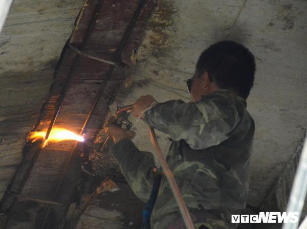 Ngay trong ngày 22/10, 5 công nhân của nhà thầu Giang Tô đã lắp giàn giáo, dùng khò lửa để cắt các thanh sắt phía gầm cầu, sau đó tháo dỡ hết lớp gỗ ở giữa cây cầu (vị trí nước thấm ra ngoài).