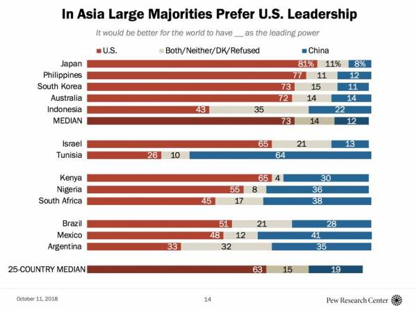 25 quốc gia khác, trong đó có Đức, Canada và Brazil chọn Mỹ với tỷ lệ áp đảo 63%. Trung Quốc tiếp tục bị bỏ xa với chỉ 19% ủng hộ. Kết quả khảo sát này được trình bày bởi Bruce Stokes- Giám đốc kinh tế toàn cầu của Pew Research, tại một Sự kiện Asia Society ở New York, Mỹ.