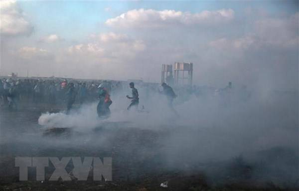Binh sỹ Israel bắn đạn hơi cay về phía người biểu tình Palestine gần khu vực biên giới Gaza-Israel. (Nguồn: THX/TTXVN)