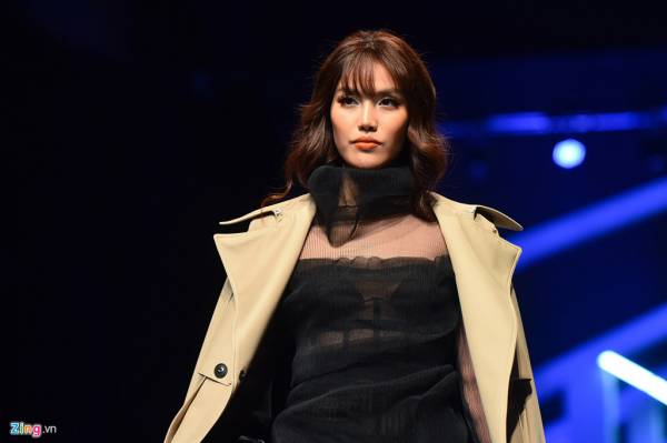 Cô diện mẫu đầm voan đen, phối cùng trench coat thanh lịch. Đây là bộ sưu tập từng được Lâm Gia Khang ra mắt tại TP.HCM hồi tháng 9, song khi mang tác phẩm của mình ra Hà Nội, anh đã thay đổi cách mix-match để mới mẻ hơn và cũng phù hợp với mùa lạnh miền Bắc.