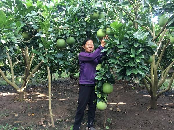 Nhờ linh hoạt trong lựa chọn giống và cách chăm sóc tốt, đồng thời áp dụng khoa học kỹ thuật vào trồng bưởi nên vườn bưởi da xanh của bà Loan cho quả đầy cành, chất lượng tốt, được nhiều thương lái đến tận vườn thu mua.