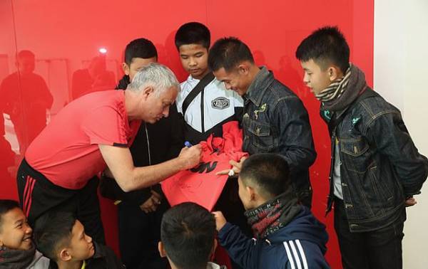 Bên cạnh những cái ôm thắm thiết, Mourinho còn vui vẻ ký tặng cho các cậu bé. Dĩ nhiên, ai nấy đều không giấu khỏi sự phấn khích vì được nhìn thấy "Người đặc biệt" cũng như dàn sao Quỷ đỏ bằng xương bằng thịt.