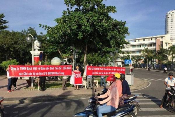 Các nhà đầu tư căn hộ du lịch tại khách sạn Bavico Nha Trang treo băng rôn “kêu cứu“.