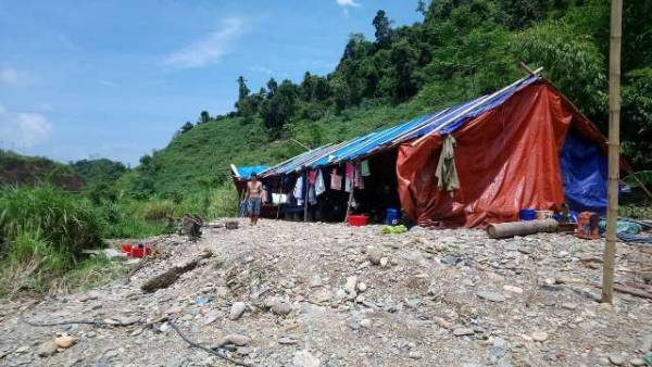 Nhà ở tạm bợ của công nhân Doanh nghiệp Bảo Toàn dựng ngay trên bãi khai thác vàng sa khoáng