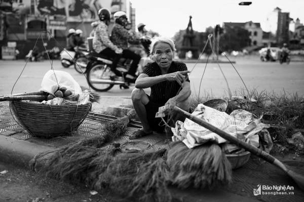 Đã bao năm, đôi quang gánh giản dị này theo bà cụ ra phố. Bà bán chổi rành, chổi đót, ngồi ngay ở Ngã tư chợ Vinh. Ảnh: Lê Thắng