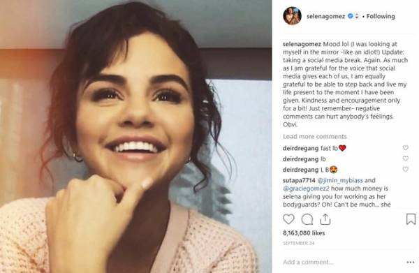 Trước đó, cô cũng xóa bức ảnh 10,6 triệu lượt thích (lớn nhất của Gomez từ trước đến nay). Điều đó cho thấy cô không quá quan tâm đến danh tiếng và tầm ảnh hưởng trên Instagram.