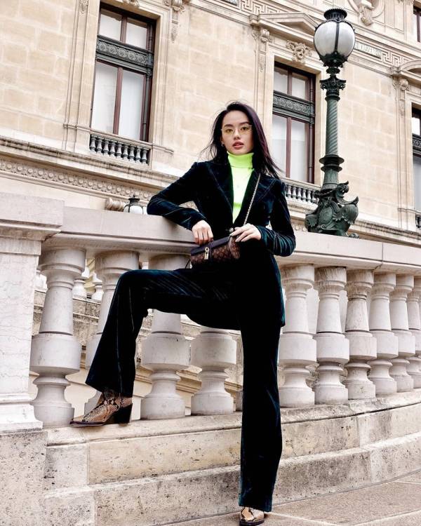 Tại Tuần lễ thời trang Paris vừa qua, Khánh Linh có cơ hội xuất hiện trong bảng best street style của các tạp chí Elle, Harper’s Bazaar và The Impression. Điều này giúp 9X Hà thành ngày càng được chú ý hơn. Với bộ suit nhung thời thượng, cô mặc cùng áo cổ lọ xanh neon. Bộ đôi giày cao gót họa tiết da rắn và túi xách LV trở thành điểm nhấn trang phục.