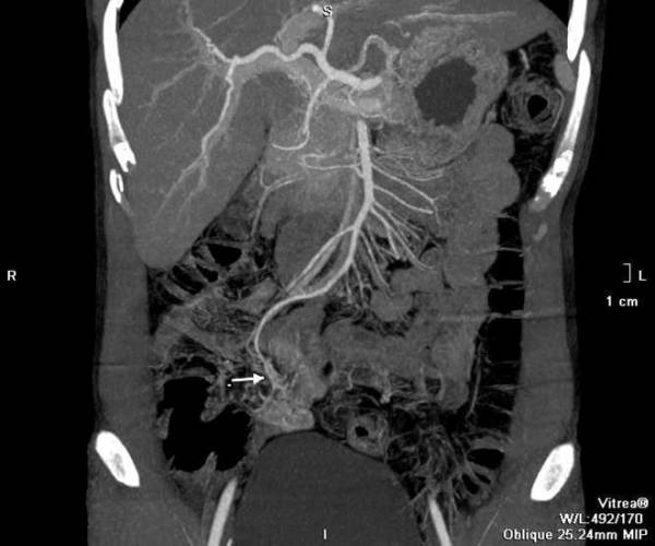 Sau hồi sức tích cực, anh C. được tiến hành chụp CT. Các bác sĩ phát hiện búi dị dạng mạch máu từ một nhánh của động mạch mạc treo tràng trên, nằm ngay trên thành ruột non, đang có dấu hiệu chảy máu. Đây là thủ phạm gây chảy máu kéo dài.