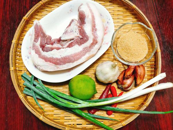 Chuẩn bị nguyên liệu: 600 gram thịt ba rọi, 1 củ tỏi, 2 củ hành khô, 1 quả ớt sừng, 2-3 thìa đường, 1/2 quả chanh, 1 thìa nhỏ dầu ăn, 1 thìa nước mắm, muối, hạt nêm, tiêu, 2 nhánh hành lá.