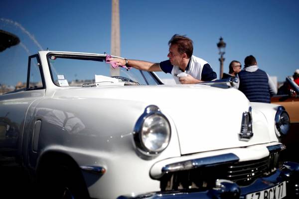 Một người đam mê xe hơi làm sạch kính chắn gió của chiếc Studebaker cabriolet trong một cuộc diễu hành trên quảng trường Place de la Concorde được tổ chức như một phần của chương trình ôtô Paris.