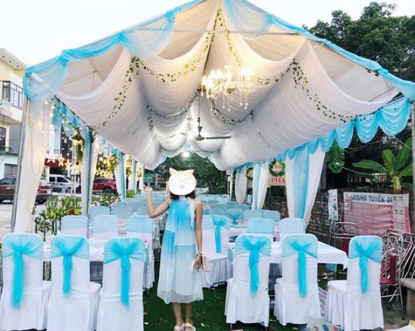 Sự trùng hợp bất ngờ khi mặc váy giống hệt màu phông bạt đám cưới khiến Hoàng Thảo gây chú ý khắp mạng xã hội.