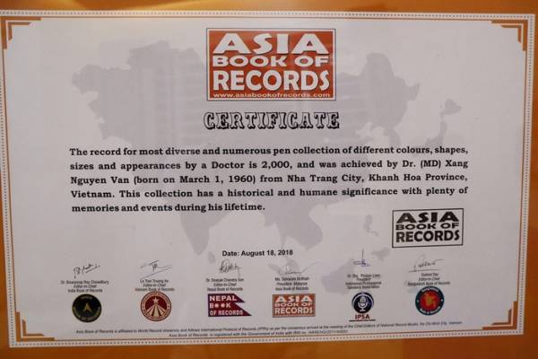 Bác sĩ Nguyễn Văn Xáng nhận bằng xác nhận kỷ lục gia của Tổ chức Kỷ lục châu Á cho người sở hữu bộ sưu tập bút viết với số lượng và chủng loại nhiều nhất.