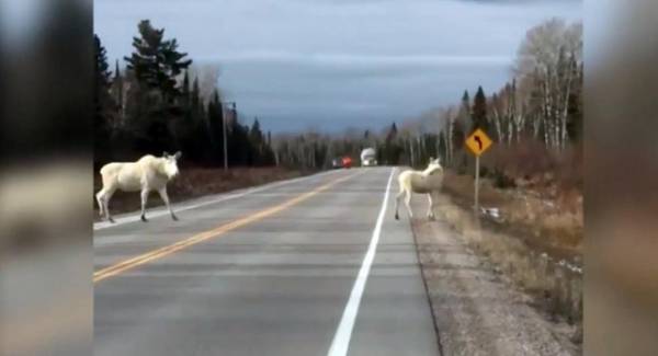 Một cặp vợ chồng đến từ miền bắc Ontario, Canada, vô cùng bất ngờ khi phát hiện có đến hai con nai sừng tấm trắng toát bất ngờ băng qua đường cao tốc.