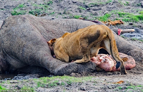 Sư tử đang thưởng thức bữa ăn thịt voi của mình.