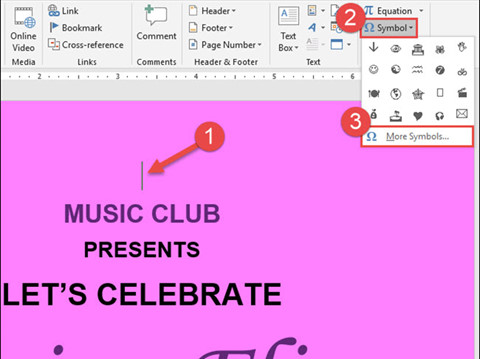 Trước tiên, đặt con trỏ chuột vào vị trí điểm chèn mà bạn muốn đặt trong tài liệu của mình, nơi bạn có thể chèn một biểu tượng nhạc. Trên thẻ Insert của thanh ribbon, nhấp vào nút Symbol, sau đó chọn More Symbols từ trình đơn thả xuống.