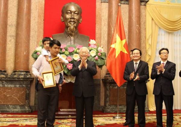 Ngô Minh Hiếu và Nguyễn Tất Minh vinh dự nhận phần thưởng của Tổng Bí thư, Chủ tịch nước Nguyễn Phú Trọng. Ảnh: Việt Cường.