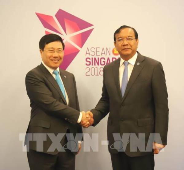 Phó Thủ tướng, Bộ trưởng Ngoại giao Phạm Bình Minh và Bộ trưởng Ngoại giao và Hợp tác quốc tế Campuchia Prak Sokhonn. Ảnh: Xuân Vịnh-Pv TTXVN tại Singapore