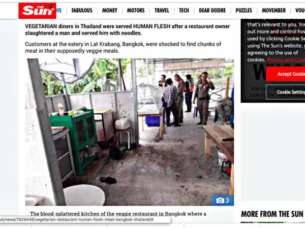 Chủ quán lấy thịt của nạn nhân làm thức ăn và phục vụ cho thực khách khác. Các tờ báo còn cho biết cảnh sát Thái Lan “đang truy tìm hung thủ đã bỏ chạy sau khi gây án”. Không thấy truyền thông trong nước nào đưa tin, mặc dù theo các tờ báo bên ngoài Thái Lan, đây là vụ án “gây chấn động” cả nước.