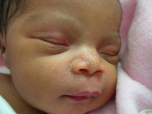 Mụn kê là những đốm mụn màu trắng sữa xuất hiện tại khu vực mũi, má, trán và một số bộ phận khác ở trẻ sơ sinh - Ảnh minh họa: Internet