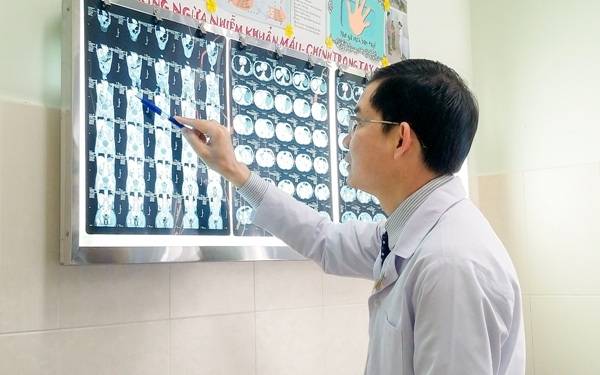 Ths.BS Nguyễn Hữu Kỳ Phương xem ảnh chụp cắt lớp bụng của bệnh nhân - Ảnh: Bệnh viện cung cấp