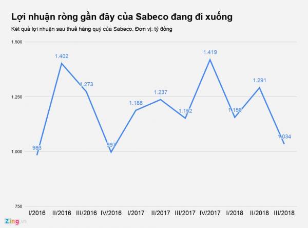 Cũng trong quý III, doanh thu tài chính của Sabeco tăng cùng với các chi phí bán hàng và quản lý doanh nghiệp giảm cho thấy sự cải thiện tích cực trong khâu vận hành và bán hàng từ khi về tay người Thái. Tuy nhiên, đà giảm mạnh của giá vốn khiến lợi nhuận sau thuế của công ty chỉ đạt 1.035 tỷ, giảm hơn 10% so với cùng kỳ. Lãi ròng công ty mẹ Sabeco thu về tương ứng chỉ đạt 975 tỷ đồng. Đây cũng là mức lợi nhuận một quý thấp nhất của công ty này kể từ đầu năm 2017 đến nay. Cùng với đó, lợi nhuận từng quý của Sabeco đang cho thấy biểu đồ đi xuống của chỉ số tài chính này.
