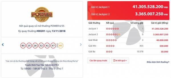 Tối 13/11/2018, dưới sự giám sát của Hội đồng Giám sát xổ số với các đại diện đến từ Bộ Tài chính, Bộ Công an và Bộ Văn hóa, Thể thao và Du lịch, Vietlott đã thực hiện quy trình quay số mở thưởng (QSMT) thứ 201 sản phẩm xổ số tự chọn Power 6/55.