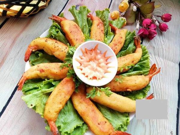 - Làm lần lượt đến hết nguyên liệu. Đem tôm chiên vàng đều. Gắp tôm ra đĩa có lót giấy thấm dầu. Xếp tôm ra đĩa khi ăn chấm kèm tương ớt và mayonnaise.