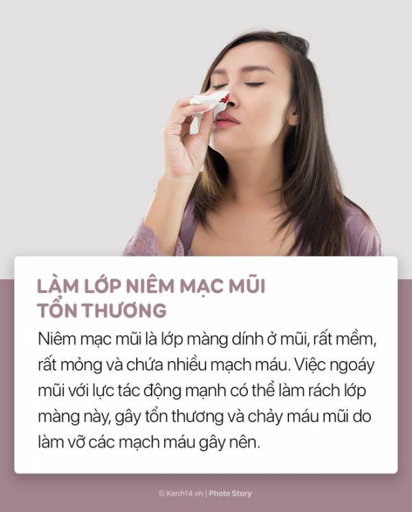 Ngoáy mũi nhiều làm khoang mũi yếu dần, khiến niêm mạc trong mũi bị kích thích tiết chất nhày nhiều hơn, lâu ngày dẫn đến viêm nhiễm, chảy máu, thậm chí đe dọa tính mạng.