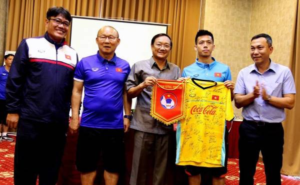 HLV Park Hang Seo thể hiện sự quyết tâm trước Đại sứ Đặc mệnh Toàn quyền Việt Nam tại Lào Nguyễn Bá Hùng và Phó chủ tịch VFF Trần Quốc Tuấn