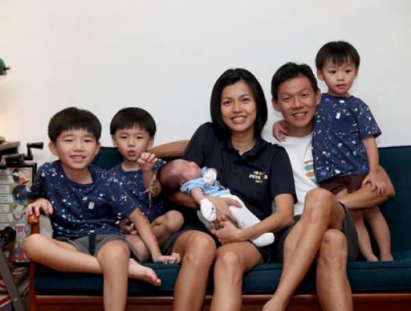 Từ trái qua phải: Lucius Loke, Andrius Loke, bà mẹ Yau Mei Siong bế bé Kaius Loke, ông bố Shamen Loke, và Justinius Loke. Ảnh: Strait Times.