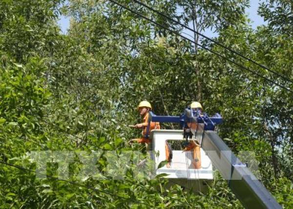 Cắt tỉa, phát quang các cây trồng vi phạm hành lang an toàn lưới điện tại xã Bình Thuận (huyện Tây Sơn, tỉnh Bình Định). Ảnh: Quốc Dũng – TTXVN