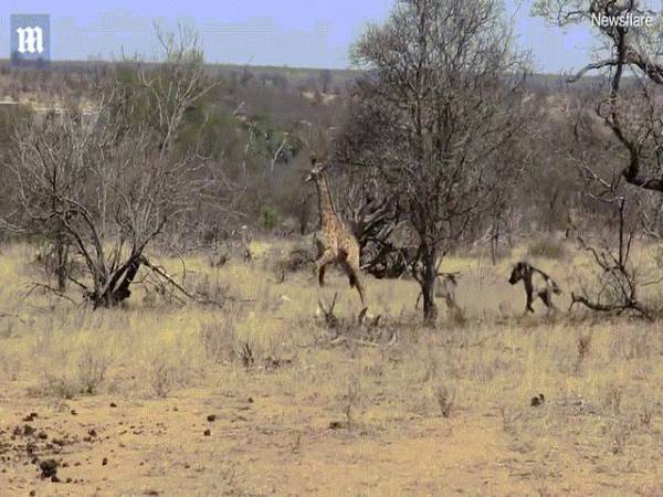 Ban đầu, có thể thấy linh cẩu đi theo con hươu, dường như chuẩn bị xơi tái con mồi. Một chân của hươu cao cổ bị linh cẩu cắn gãy suýt rời khiến con vật đáng thương phải đi với 3 chân.
