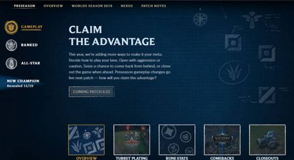 Trong phần Lối Chơi, Riot Games giới thiệu mục khác nhau để giới thiệu 4 thay đổi quan trọng trong Tiền Mùa Giải 2019. Bao gồm: Lá Chắn Trụ, Chỉ Số Ngọc, Lật Kèo và Kết Thúc Trận Đấu. Mỗi mục sẽ giải thích khá rõ ràng ví dụ như Trụ giờ đây sẽ khó phá hơn, Ngọc Tái Tổ Hợp sẽ có thêm phần cộng thêm chỉ số cho tướng, farm lính giờ đây sẽ cho nhiều vàng hơn nhằm tạo điều kiện các đội có thể lật kèo dễ dàng hơn và cuối cùng là lính giờ đây sẽ có máu và tốc độ di chuyển nhanh hơn để trận đấu kết thúc nhanh chóng hơn.