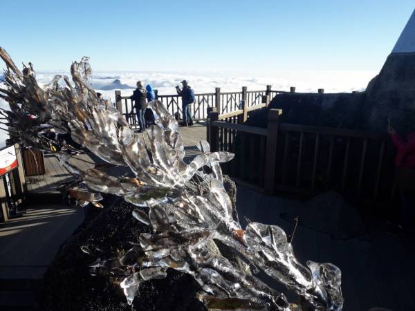 Những du khách đầu tiên tại đỉnh Fansipan rất thích thú với những hình ảnh băng bám dày đặc trên các nhành cây, tạo nên những khối pha lê trong suốt.