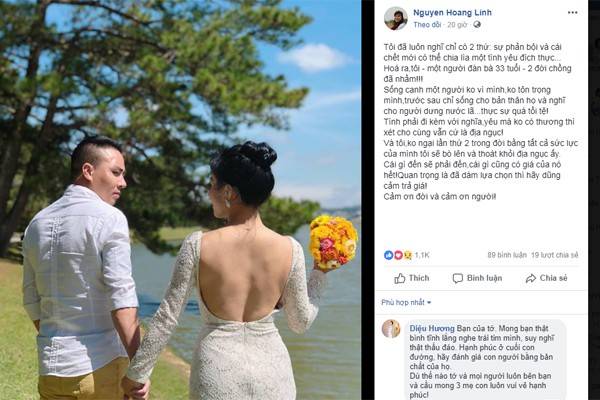 MC Hoàng Linh : "Tôi đã luôn nghĩ chỉ có 2 thứ: Sự phản bội và cái chết mới có thể chia lìa một tình yêu đích thực. Hoá ra, tôi - một người đàn bà 33 tuổi - 2 đời chồng đã nhầm. Sống cạnh một người không vì mình, không tôn trọng mình,trước sau chỉ sống cho bản thân họ và nghĩ cho người dưng nước lã thực sự quá tồi tệ. Tình phải đi kèm với nghĩa, yêu mà không có thương thì xét cho cùng vẫn cứ là địa ngục. Và tôi, không ngại lần thứ 2 trong đời bằng tất cả sức lực của mình tôi sẽ bò lên và thoát khỏi địa ngục ấy.