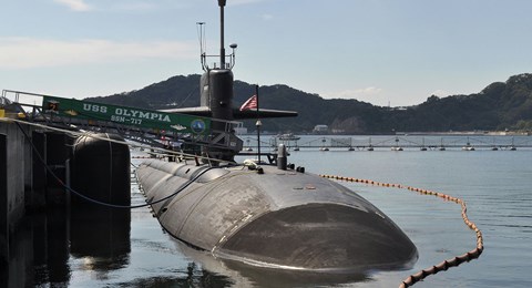 Một tàu ngầm lớp Los Angeles của Mỹ đang neo đậu để chờ xuất quân.