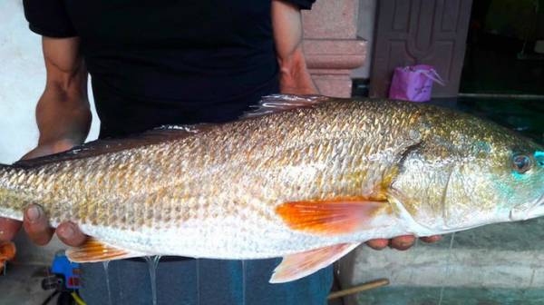 Qua kiểm tra, con cá dài 0,75m, nặng gần 5kg. Vây cá màu đỏ nhạt, bụng màu trắng, lưng vàng ươm như nghệ.