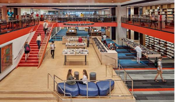 Cả một sảnh khổng lồ với không gian mở sẽ là nơi được trưng bày các bàn đọc sách cao cấp và các tầng đều được kết nối với nhau thông qua qua một cầu thang đơn và các hành lang lớn sẽ là những giá sách cao.