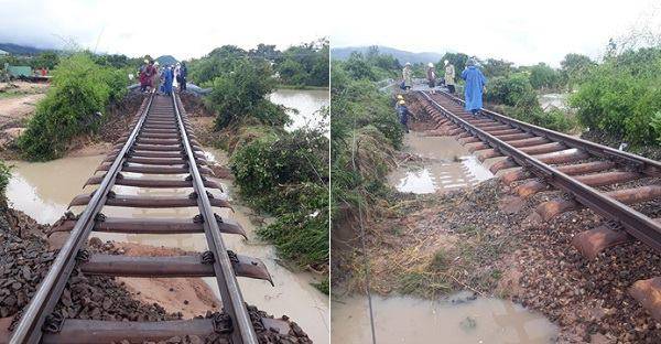 Hơn 300 m đường sắt Bắc - Nam, đoạn đi qua địa bàn xã Công Hải, H.Thuận Bắc (Ninh Thuận), bị nước lũ tàn phá, giao thông đường sắt tê liệt.