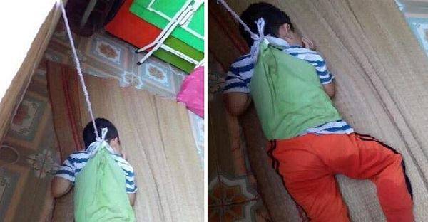 Hình ảnh bé trai 4 tuổi bị buộc dây treo vào cửa sổ ở trường mầm non.