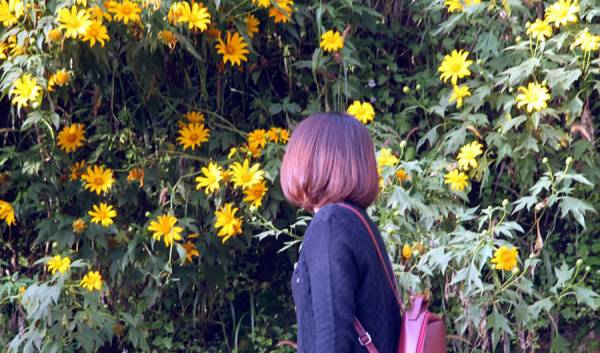 Chúng tôi dừng lại ở một đoạn đường ôm một vòng cua. Hai bên đường là hoa. Dã quỳ tỏa sắc khiến con đường đẹp đến nao lòng. Hoa chen trên cao, hoa sà xuống thấp, mùi hương dịu nhẹ tỏa lan. Nhìn xuống thung lũng là cả một lũng hoa vàng miên man, tít tắp.