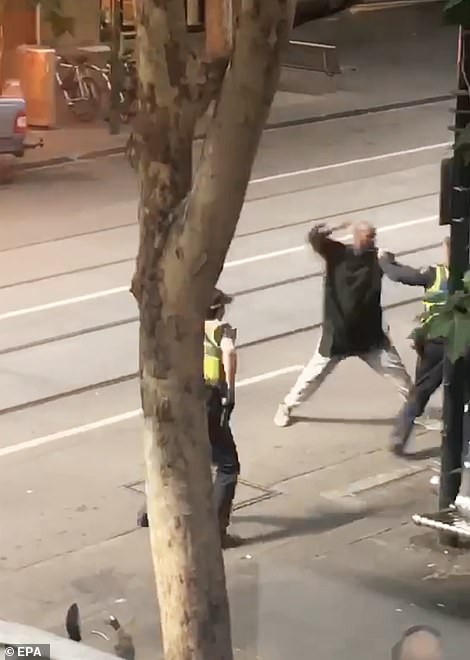 Video quay từ hiện trường cho thấy gã đàn ông đã cố cầm dao tấn công hai nhân viên cảnh sát trước khi bị bắn vào cổ và gục xuống đất.