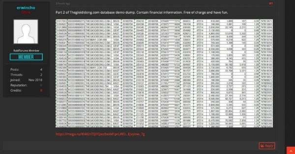 Hai file đưa lên diễn đàn cho giới hacker được cho là thông tin thẻ ngân hàng của khách mua hàng của Thế Giới Di Động tuy nhiên nhà bán lẻ này phủ nhận.