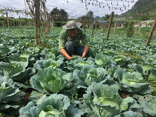 Anh Đoàn Văn Trinh, sinh năm 2000, tiểu khu 84/85 (thị trấn Nông trường, huyện Mộc Châu, tỉnh Sơn La) trồng 6.000m2 rau cải bắp trên đất vườn sau nhà, mỗi năm anh Trinh thu lãi khoảng 100 triệu đồng.