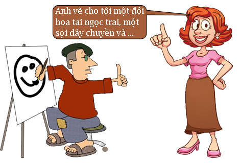 - Anh vẽ cho tôi một đôi hoa tai ngọc trai, một sợi dây chuyền và nhẫn bằng kim cương, một chiếc vòng tay ngọc lục bảo và một chiếc đồng hồ bằng vàng nhé!