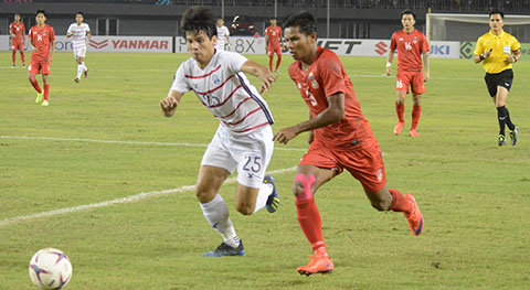 Win Thain Thein (phải) lỡ trận đấu với ĐT Việt Nam vì án treo giò.